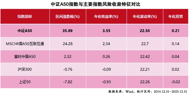 中證A50指數(shù)的成份股一直是公募基金等內(nèi)資機(jī)構(gòu)投資者,以及以北向資金為代表的外資機(jī)構(gòu)投資者重倉的核心資產(chǎn)。此外,中證A50指數(shù)的新經(jīng)濟(jì)板塊占比較高,指數(shù)成份股的盈利能力和成長(zhǎng)能力較強(qiáng)。據(jù)Wind數(shù)據(jù)統(tǒng)計(jì),截至2023年9月30日,中證A50指數(shù)成份股的凈資產(chǎn)收益率中位數(shù)為14.83%,凈利潤(rùn)增速的中位數(shù)為6.53%,均高于上證50、滬深300等主流寬基指數(shù)。自指數(shù)基日2014年12月31日以來截至2023年12月31日,中證A50指數(shù)的累計(jì)漲幅為35.69%,年化回報(bào)為3.55%,優(yōu)于同期的上證50、滬深300等寬基指數(shù),也優(yōu)于MSCI中國A50互聯(lián)互通指數(shù)、富時(shí)中國A50指數(shù)等同類指數(shù),同時(shí)中證A50指數(shù)的波動(dòng)率偏小、夏普比更高,體現(xiàn)出更優(yōu)的風(fēng)險(xiǎn)收益比。