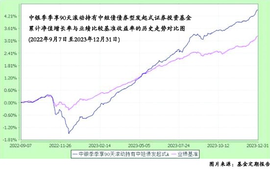 從歷史業(yè)績來看,自2022年9月7日成立以來,中銀季季享表現(xiàn)相對亮眼。基金定期報告顯示,截至2023年年底,中銀季季享A成立以來累計收益率4.51%,同期業(yè)績比較基準(zhǔn)收益率3.24%;過去一年收益率5.49%,同期業(yè)績比較基準(zhǔn)為3.19%,同類排名位列1/143(業(yè)績來源:基金定期報告,截至2023年12月31日;同類排名為債券基金-純債債券型基金-中短期純債債券型基金<A類>,數(shù)據(jù)來源:銀河證券,數(shù)據(jù)區(qū)間2023.1.1-2023.12.31)。