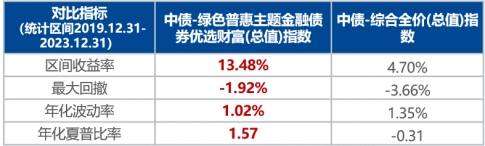 據(jù)Wind數(shù)據(jù),從中債綠色普惠主題金融債券優(yōu)選指數(shù)的基日2019年12月31日起,截至2023年12月31日,中債綠色普惠主題金融債券優(yōu)選指數(shù)的區(qū)間漲幅高達(dá)13.48%,遠(yuǎn)高于中債-綜合全價(jià)指數(shù)4.70%的漲幅,同期最大回撤、年化波動(dòng)率、年化夏普比率等指標(biāo)也明顯更優(yōu)。