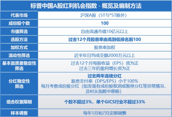 接下來(lái),標(biāo)普中國(guó)A股紅利機(jī)會(huì)指數(shù)會(huì)對(duì)股票進(jìn)行基本面質(zhì)量穩(wěn)定性篩選和分紅穩(wěn)定性篩選:其基本面質(zhì)量穩(wěn)定性篩選個(gè)股的指標(biāo)是2個(gè)維度,一是過(guò)去12個(gè)月每股收益(EPS)須為正,二是過(guò)去三年的盈利增長(zhǎng)須為正;其分紅穩(wěn)定性篩選個(gè)股的指標(biāo)是3個(gè)維度,一是過(guò)去兩年必須連續(xù)分紅,二是股息支付率(每股分紅DPS/每股盈利EPS)小于100%,三是每月考察成份股分紅(如發(fā)現(xiàn)有成份股取消或暫停分紅等異常情況,就及時(shí)從指數(shù)中移除該成份股)。經(jīng)過(guò)如此一番“嚴(yán)選”操作,就在更大程度上減少了陷入“基本面”之坑和“突擊分紅”之坑的風(fēng)險(xiǎn)。