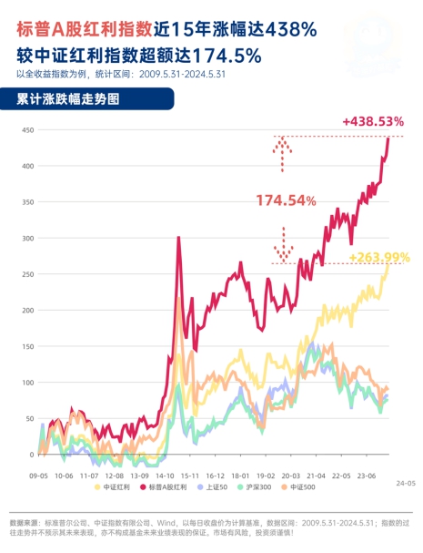 在全收益口徑下,標(biāo)普中國(guó)A股紅利機(jī)會(huì)指數(shù)自2009.5.31以來(lái)截至2024.5.31的15年間,其累計(jì)漲幅達(dá)438.53%,大幅超越上證50、滬深300、中證500等“老牌”寬基指數(shù)同期表現(xiàn)。紅利策略穿越A股牛熊考驗(yàn),更彰顯了長(zhǎng)期投資價(jià)值。