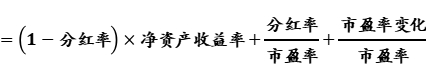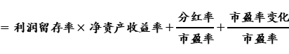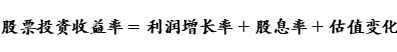 要想回答這個問題,首先我們需要了解紅利指數(shù)的收益率源于何處?通常地,我們可以把股票投資的預(yù)期收益率拆解為三個部分:利潤增長率、股息率、估值變化。即: