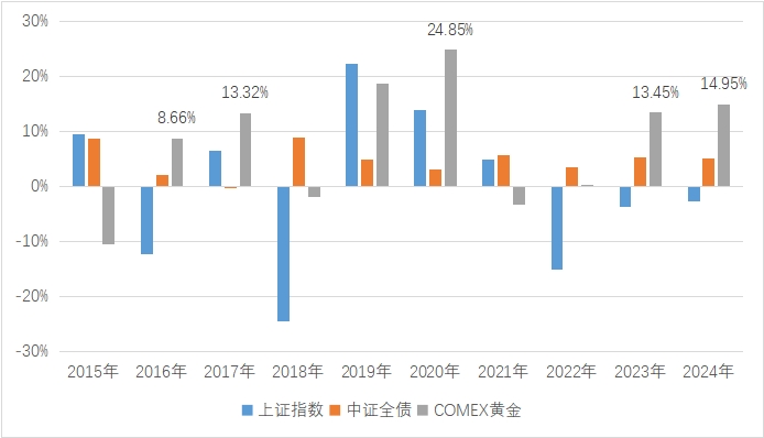 從近10個年度的表現看,COMEX黃金有5個年度跑贏了股、債兩類資產。其中,在股債雙殺的2016年,COMEX黃金上漲8.66%,2017年繼續大漲13.32%,2020年在疫情帶來的諸多不確定的情況下,COMEX黃金漲幅更是高達24.85%,而在海外環境多變、經濟復蘇偏弱的近兩年中,黃金也有出色表現。(數據來源:WIND,截至2024年7月29日)