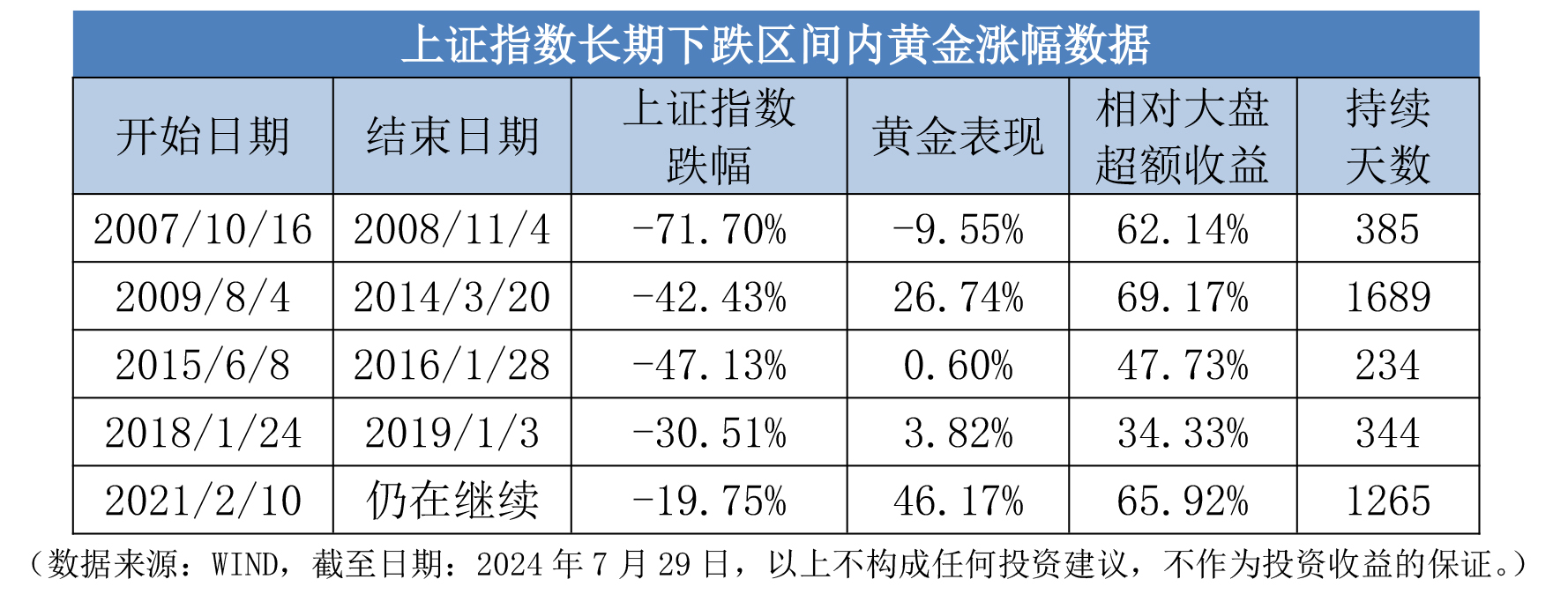 比如在那次5178點股市大牛市前,上證指數曾經歷了長達近1700天的漫長震蕩下跌過程。此階段內,上證指數跌了42.43%,而黃金上漲26.74%。(數據來源:WIND,截至日期:2024年7月29日。)