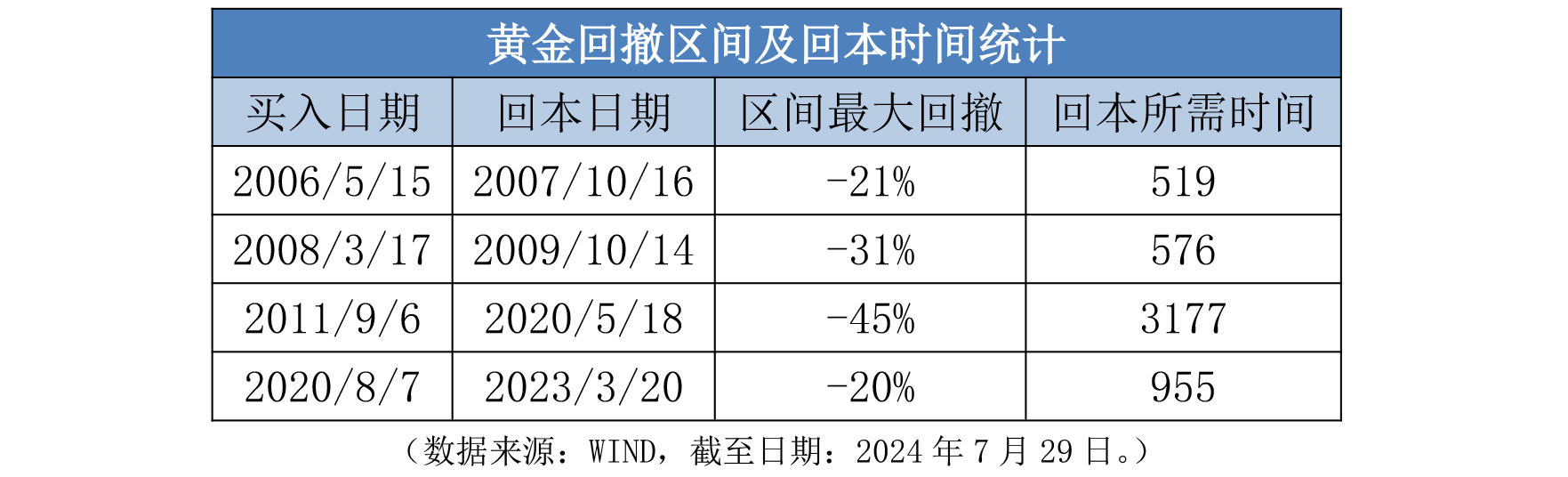 另一方面,即使買在黃金熊市前的價格最高點,后續也大概率能回本。因此,即使黃金近期遭遇回調,大家可以少些擔心。(數據來源:WIND,截至日期:2024年7月29日。)