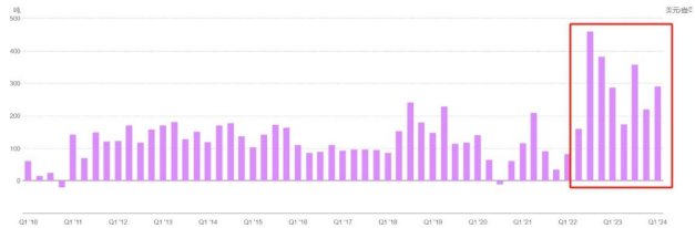 此外,近年來,全球央行成為黃金市場上的大買家,持續(xù)增加黃金儲備,對金價形成有力支撐。世界黃金協(xié)會數(shù)據(jù)顯示,從2022年二季度開始,各國央行購金需求大幅上揚,創(chuàng)下2010年以來最高記錄。