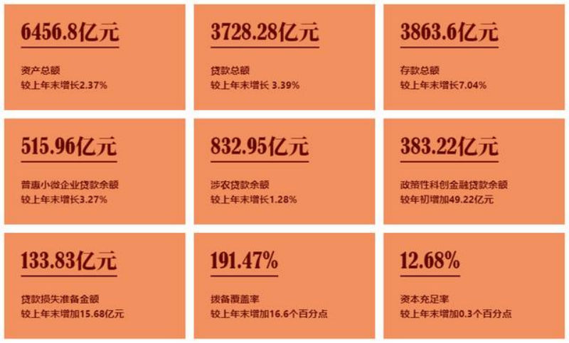 截至報告期末,涉農貸款余額832.95億元,較上年末增長10.56億元,增幅1.28%;金融精準扶貧貸款余額9.77億元,較上年末增長0.25億元。