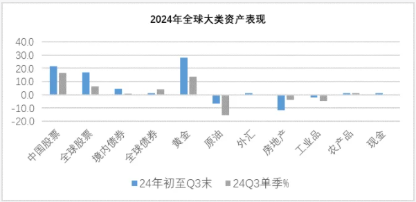 三季度A股市場延續(xù)二季度跌勢,9月下旬宏觀政策轉向,引發(fā)股市放量上漲,債市呈現(xiàn)“慢牛快熊”態(tài)勢,受監(jiān)管調控影響劇烈波動。海外股市延續(xù)漲勢,但波動加劇。商品市場中,黃金屢創(chuàng)新高,原油持續(xù)下探。