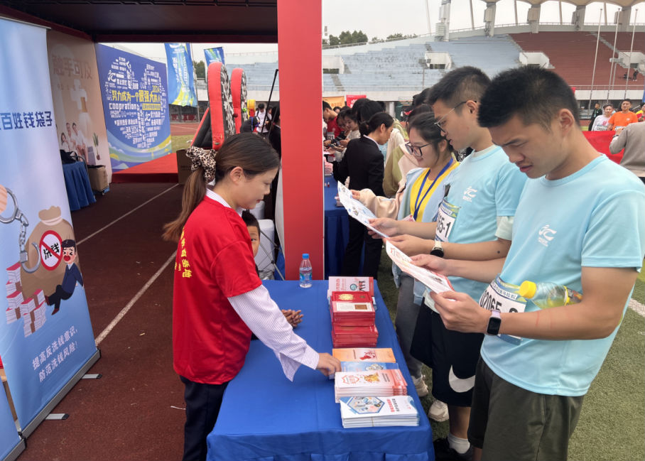 為確保本次宣教活動的成功開展,工行無錫濱湖支行提前做好充分的準備工作,結合當天的校園馬拉松活動,在江南大學體育場設立了宣傳專區,在專區擺放了豐富的反洗錢宣傳資料,包括反洗錢宣傳折頁、海報等,營造出濃厚的宣教氛圍。此外,工作人員精心準備宣講內容,并設置一系列金融反詐小問題吸引師生參與,致力于為到場的師生提供優質的金融知識。