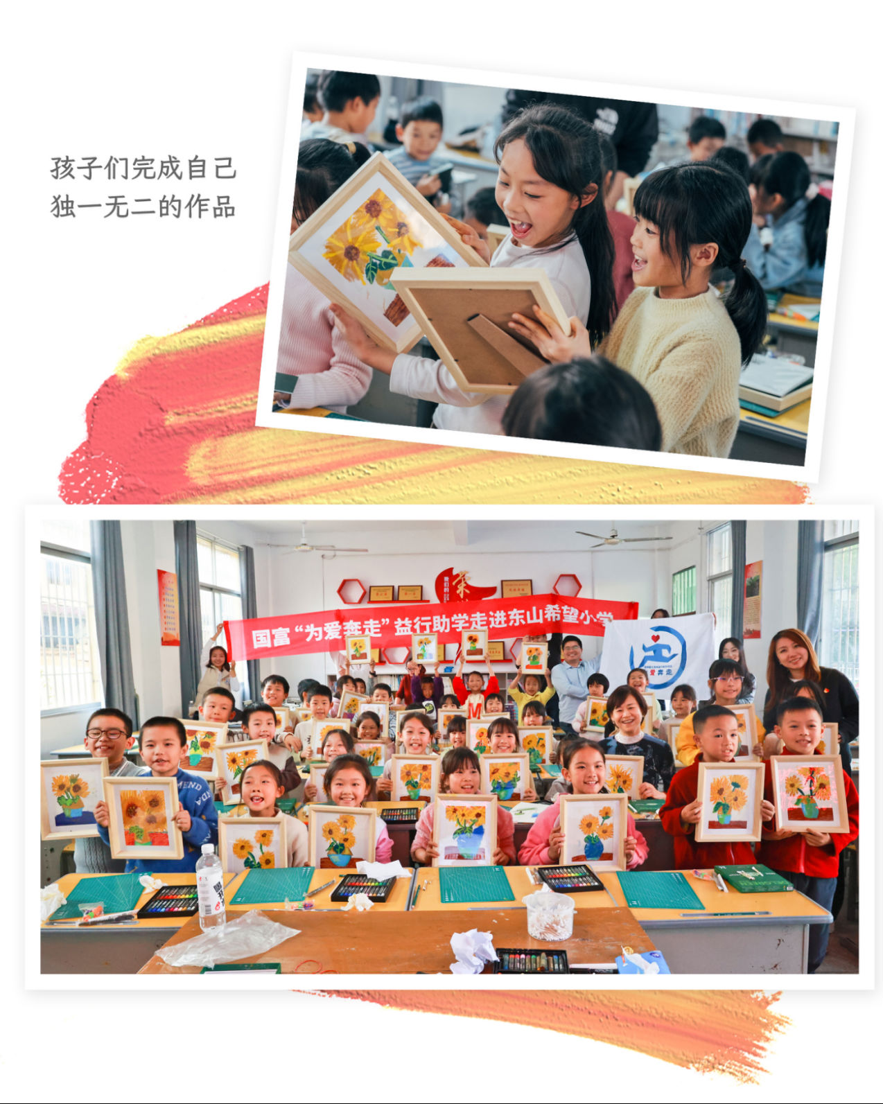 “大家有沒有見過這幅向日葵?他由100多年前的荷蘭畫家梵高創作,他是一位顏色的魔術師。”在重彩油畫棒支教課上,國海富蘭克林基金的志愿者帶領三(一)班的孩子們認識梵高的《向日葵》。