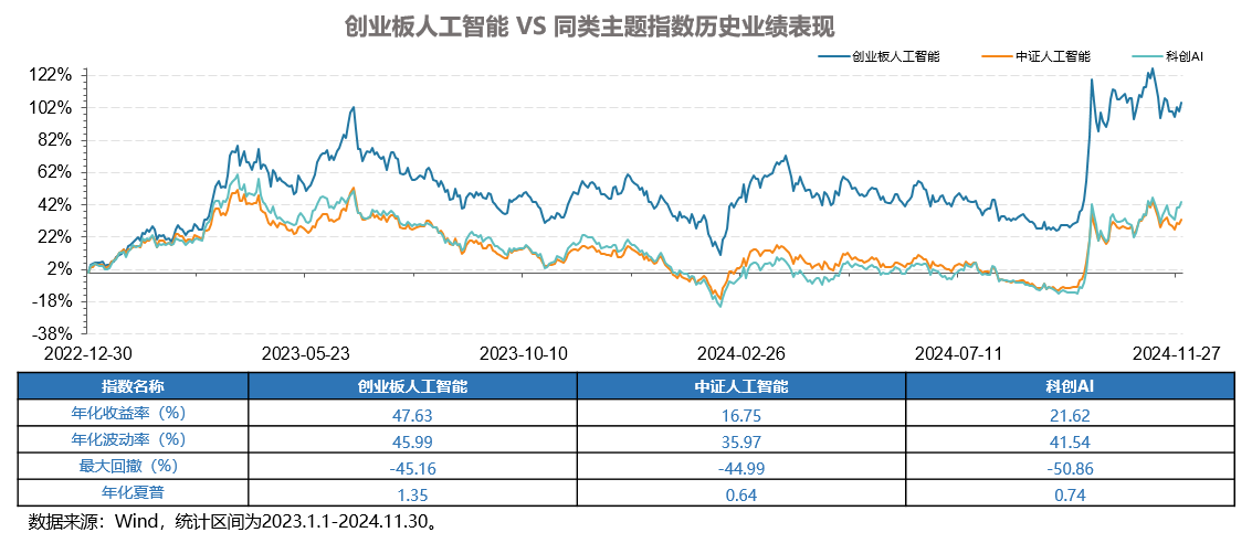 2023年以來,創(chuàng)業(yè)板人工智能指數(shù)收益顯著跑贏同類主題指數(shù)。Wind統(tǒng)計數(shù)據(jù)顯示,2023.1.1-2024.11.30期間,創(chuàng)業(yè)板人工智能指數(shù)累計漲幅為105.41%,同期中證人工智能主題指數(shù)、科創(chuàng)AI指數(shù)累計漲幅分別為33.13%、43.58%。