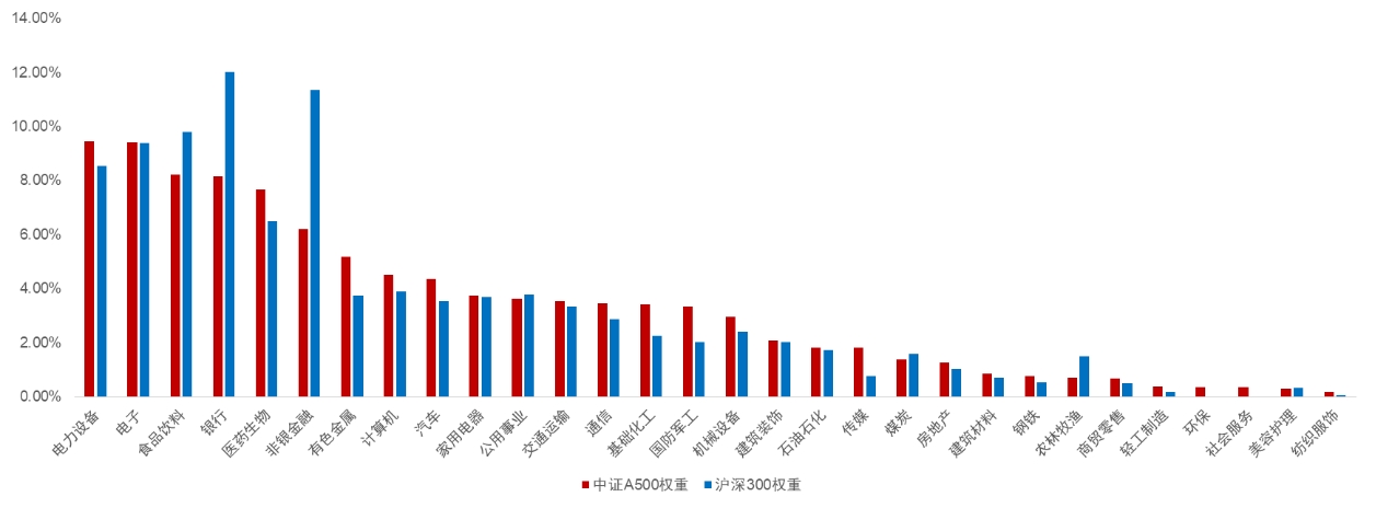 第二,相較傳統寬基指數,中證A500指數的新經濟含量更高。中證A500指數相較滬深300指數顯著超配電力設備、計算機、通信和國防軍工等新質生產力方向,降低金融和消費等傳統行業占比,使得指數能夠全面刻畫經濟發展結構的變化與產業的轉型升級。