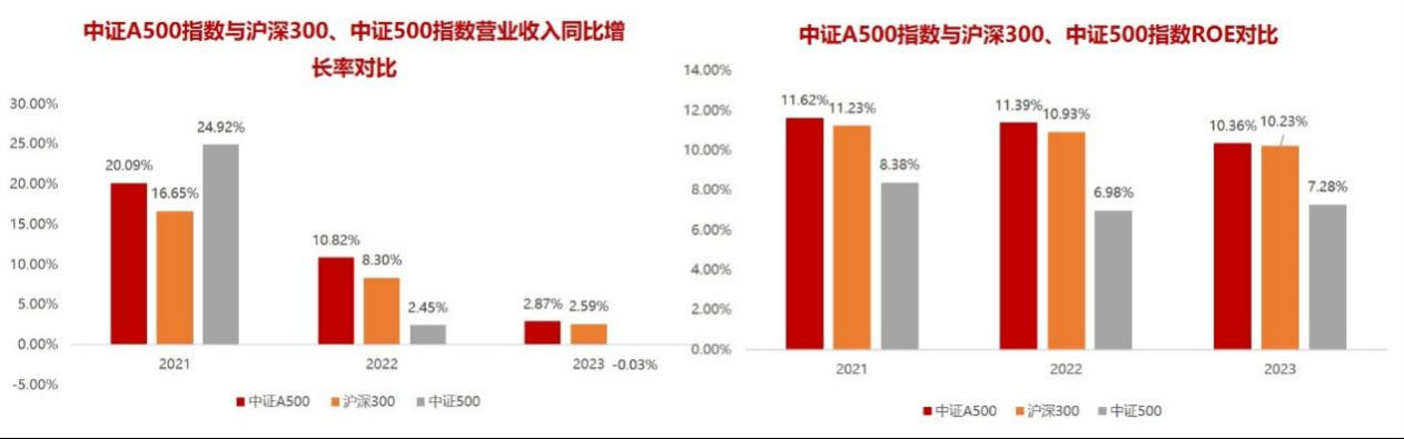 蔣俊陽:2023年度,中證A500指數營業收入同比增長率為2.87%,優于滬深300、中證500指數。最近3年,中證A500指數凈資產收益率(ROE)均值為11.12%,略優于滬深300指數,顯著高于中證500指數。