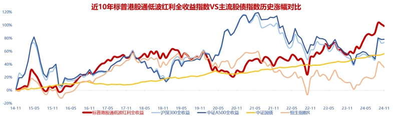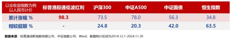 以2025年1月2日起發行的華寶港股通低波紅利指數基金(A類022887/C類022888)為例,其跟蹤標的指數——標普港股通低波紅利指數(全收益)長期收益亦顯著跑贏各主流股債指數,實現了可觀的超額收益。截至2024年11月末,該指數近10年累計漲幅為98.3%,同期滬深300、中證A500、中證國債、恒生指數累計漲幅分別為73.5%、78.0%、56.3%、34.8%,其相對的超額收益分別達24.8%、20.3%、42.0%、63.5%。