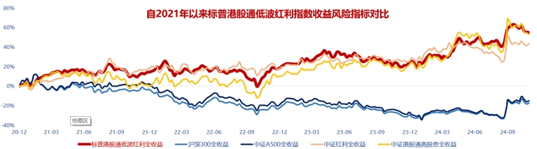 在2021年至2024年11月末反復震蕩的行情期間,標普港股通低波紅利指數亦展現出強勁的韌性與向上彈性。相較于主流寬基指數和同類紅利主題指數,標普港股通低波紅利指數在收益率、波動率、夏普比率、回撤控制等方面均展現可觀的優勢。2021年至2024年11月末期間,該指數累計漲幅為55.0%,顯著領先同期滬深300、中證A500、中證紅利、中證港股通高股息指數-17.4%、-15.0%、43.6%、52.7%的累計漲幅。同期間標普港股通低波紅利指數最大回撤為-22.8%,同期滬深300、中證A500、中證紅利、中證港股通高股息指數最大回撤分別為-41.6%、-41.0%、-18.4%、-26.9%。同期間標普港股通低波紅利指數年化夏普比率為0.77,同期滬深300、中證A500、中證紅利、中證港股通高股息指數年化夏普比率分別為-0.25、-0.20、0.60、-0.58,這顯示該指數風險調整后的收益率相對于主流股債指數亦處于領先水平。