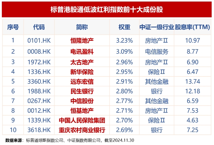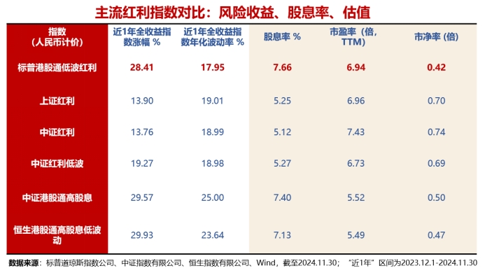 標普港股通低波紅利指數之所以風險調整后的收益表現相對領先,通過獨具特色的指數編制方案實現了股息率和估值指標的領先是根本原因。從上表可以看到,截至2024年11月末,標普港股通低波紅利指數股息率達7.66%,顯著高于同期上證紅利、中證紅利、中證紅利低波、中證港股通高股息、恒生港股通高股息低波動指數5.25%、5.12%、5.27%、7.40%、7.13%的股息率。該指數同期市凈率為0.42倍,亦顯著低于同期上證紅利、中證紅利、中證紅利低波、中證港股通高股息、恒生港股通高股息低波動指數0.70、0.74、0.69、0.50、0.47的市凈率。