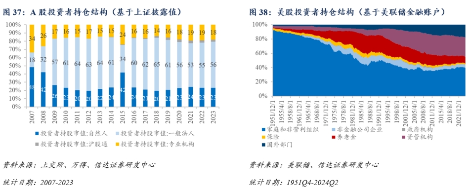 根據信達證券報告,2023年A股機構投資者占比僅20%左右,而相似口徑下美股專業投資者持股占比則接近40%。此外,A股外資占比3%左右,相似口徑下美股外資持股占比達到20%。