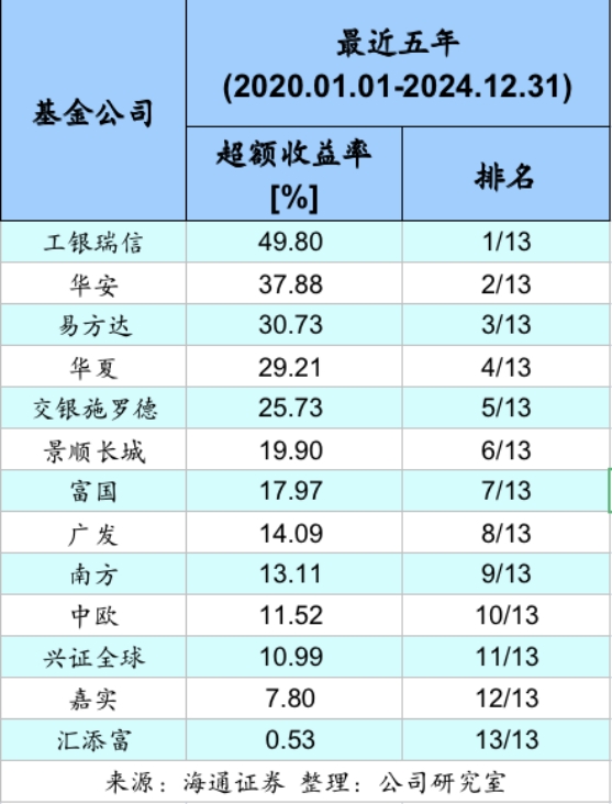 根據海通證券發布的《基金公司權益及固定收益類資產超額收益排行榜》,截至2024年末,工銀瑞信旗下主動權益基金近五年的超額收益率達到49.80%,位列權益類大型公司第一。