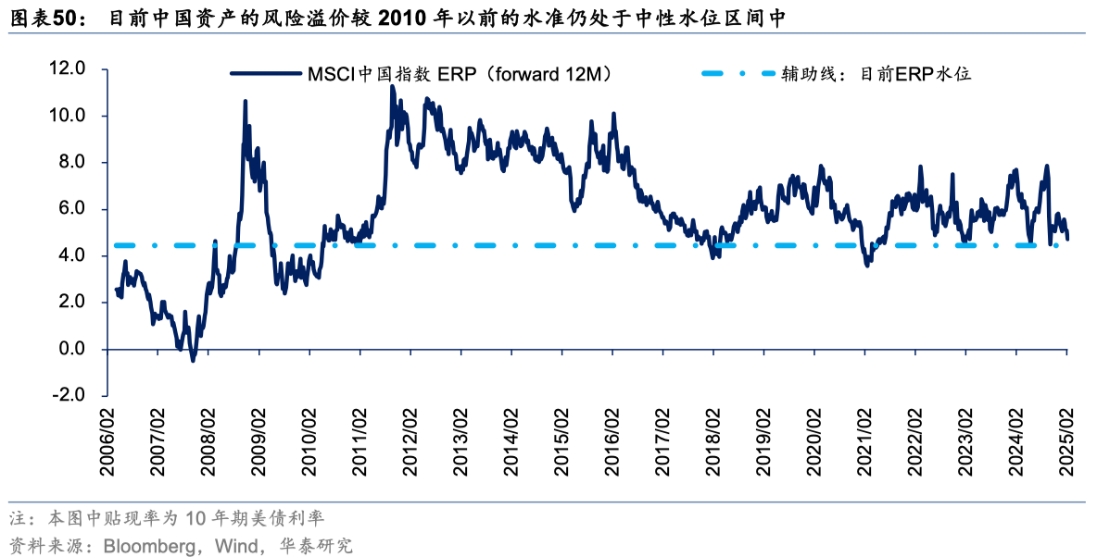 縱向對比來看,盡管目前中國資產的前向風險溢價已經來到近年來的相對低位,但若以20年視角來衡量(自2006年以來),目前中國資產的風險溢價較2010年以前的水準仍處于中性水平區間中。
