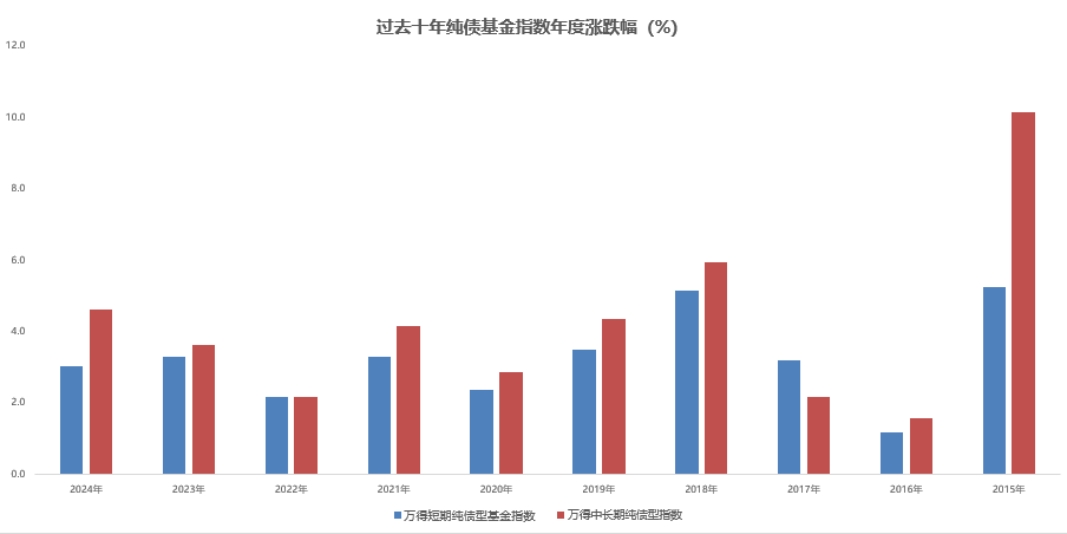 純債基金與股票市場相關性較低,歷史業績相對平穩。回看過往十年間,無論是萬得短期純債基金指數還是萬得中長期純債基金指數,二者均實現“年年正收益”。通過長期持有,投資者有望實現跨越周期的穩健回報。