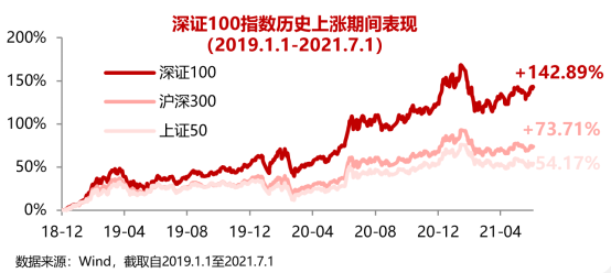 藍籌成長的特色定位,令深證100指數在歷史上漲行情中更具進攻彈性。據Wind統計,該指數在2019.1.1-2021.7.1的歷史行情上漲期間累計收益率為142.89%,年化收益率為44.21%,相對上證50指數、滬深300指數的累計超額收益分別為88.73%、69.19%,年化超額收益分別為24.66%、18.63%。