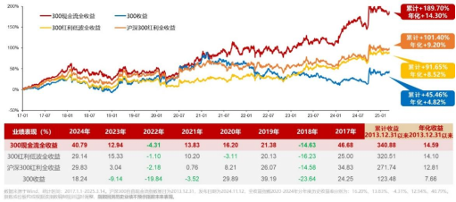 滬深300插上了“自由現金流”的翅膀,也實實在在跑出了超額收益。據Wind數據統計,自2017年以來截至2025年3月14日,300現金流全收益指數累計收益為189.70%,年化收益率為14.30%,大幅跑贏滬深300、滬深300紅利以及300紅利低波指數。