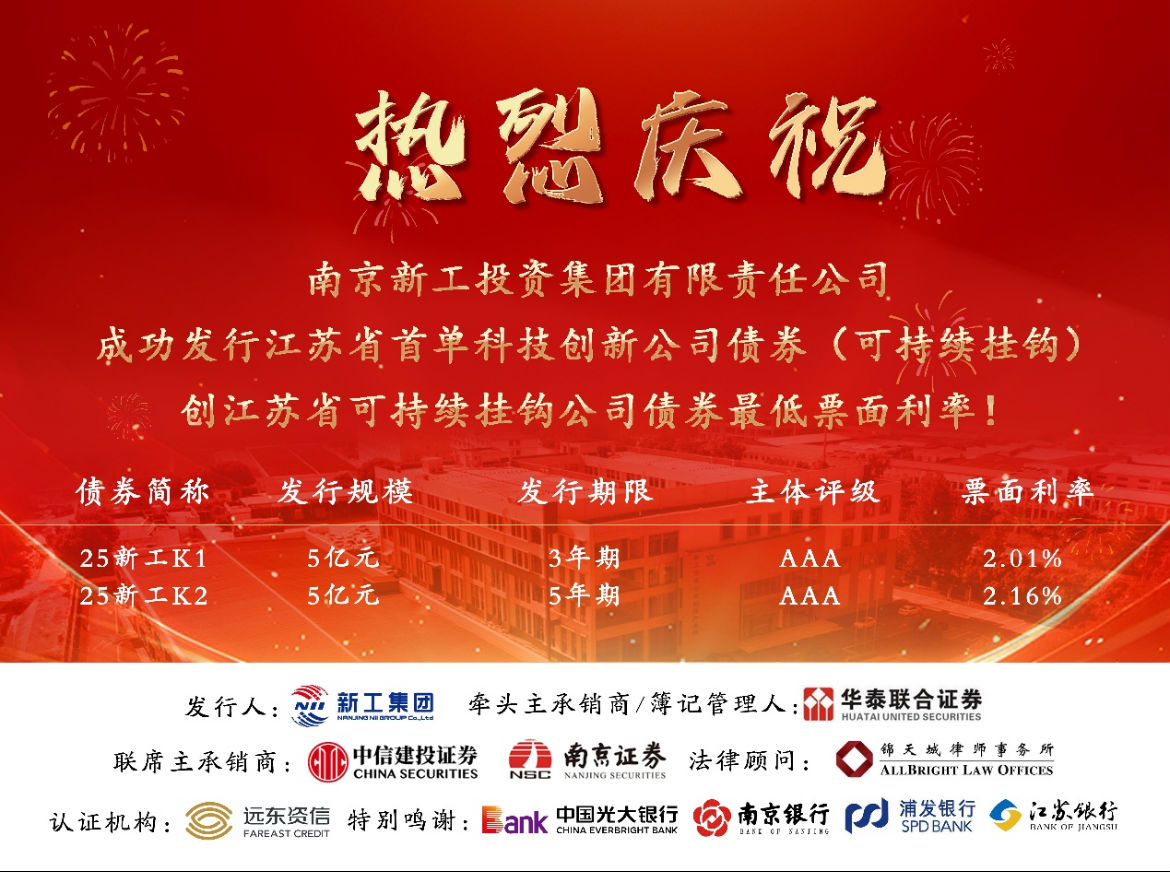 2025年4月2日,南京新工投資集團有限責任公司在上海證券交易所成功發行了江蘇省首單科技創新公司債券(可持續掛鉤)。本期債券募集資金總額10億元,采用3年期與5年期雙向互撥機制,滿足投資者多元化投資需求,其中:3年期發行規模5億元,發行利率為2.01%;5年期發行規模5億元,發行利率2.16%,創江蘇省可持續掛鉤債券發行利率的新低,同時也是公司歷史發行公司債券價格最低。