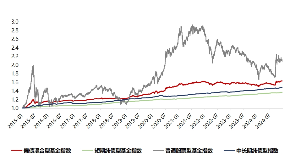 數(shù)據(jù)來源:wind。統(tǒng)計2015-1-1至2024-12-31,業(yè)績?nèi)∑珎旌闲突鹬笖?shù)(885003.WI)、短期純債型基金指數(shù)(885062.WI)、中長期純債型基金指數(shù)(885062.WI)、普通股票型基金指數(shù)(885000.WI)。歷史業(yè)績不代表未來表現(xiàn)。