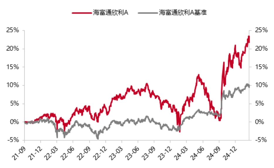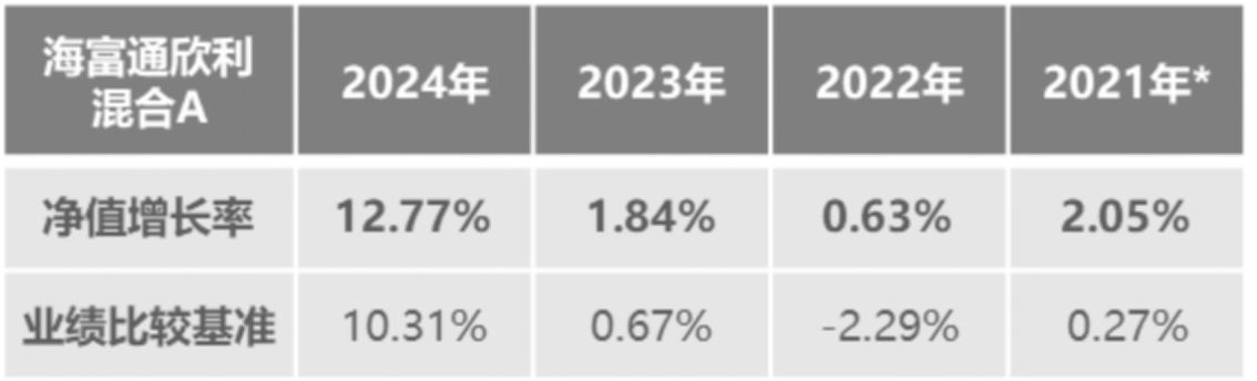 注1:海富通欣利混合A類份額2021-2024年度凈值增長率為2.05%、0.63%、1.84%、12.77%,C類份額凈值增長率為1.99%、0.42%、1.64%、12.65%,業績比較基準收益率為0.27%、-2.29%、0.67%、10.31%,2021年度業績為自合同生效日(2021年9月14日)起計算。其間歷任基金經理:江勇(2021/9至今)。數據來源:基金定期報告。