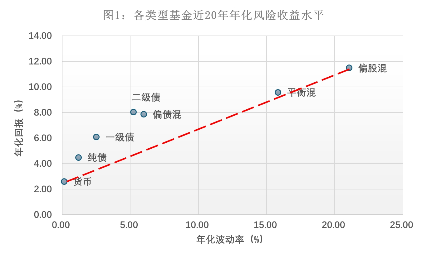 首先,我們來看看,偏債混合型基金在風險收益坐標系中的位置。我們統(tǒng)計了不同類別基金近20年的年化回報和年化波動率,繪圖如下: