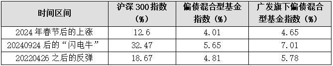 根據(jù)貓頭鷹研究院統(tǒng)計,近3年A股有3次階段性上漲行情,分別發(fā)生在2024年春節(jié)后、2024年9月底和2022年5月。在這三個權益市場回暖的階段,廣發(fā)基金管理的偏債混合型基金均表現(xiàn)出了較好的收益彈性,表現(xiàn)在規(guī)模Top10公司中居前,且這一風格較為穩(wěn)定。