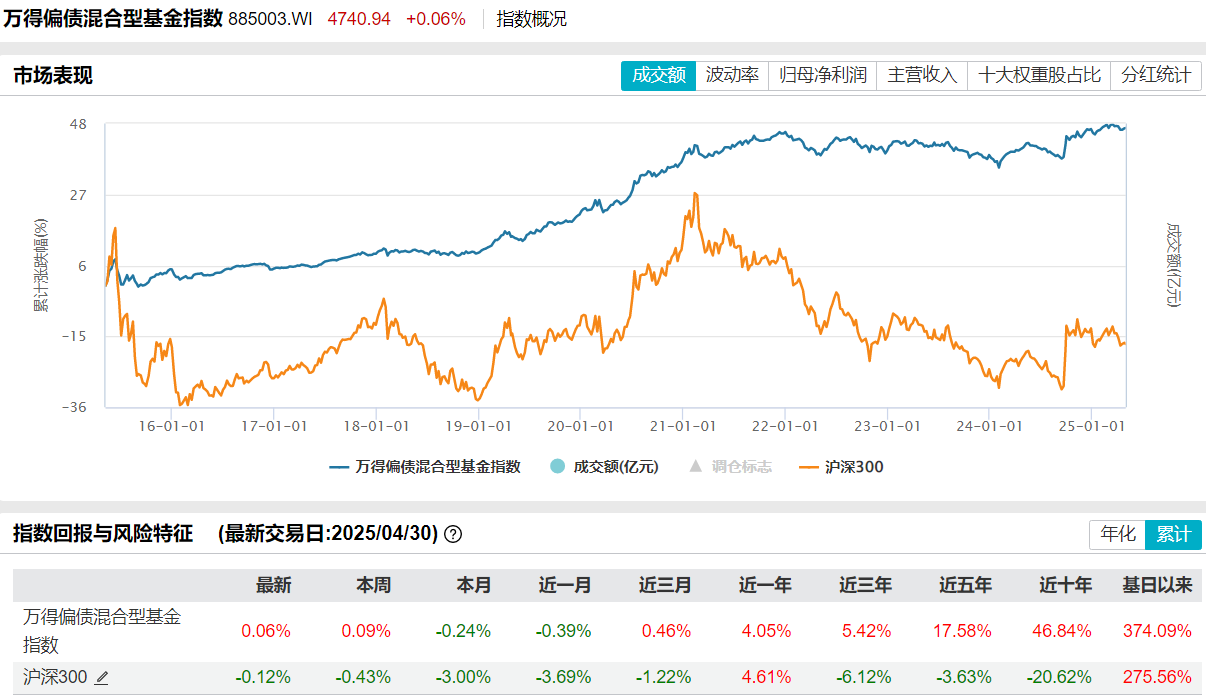 以(885003)萬得偏債混合型基金指數(shù)為例,可以看到,自2003年12月31日基日以來,截至2025年4月30日,近22年,穿越多輪牛熊周期,其年化收益依然可達(dá)到7.8%,累計(jì)收益有374.09%。可以說,這個(gè)收益回報(bào)相當(dāng)可觀了。