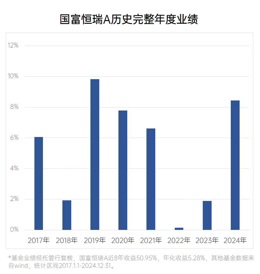從歷史業(yè)績(jī)來看,國(guó)富恒瑞A成立以來8個(gè)完整會(huì)計(jì)年度均實(shí)現(xiàn)正收益,過去8年間年化收益5.28%,為全市場(chǎng)唯一的一只過去8年正收益,且年化收益超過5%的二級(jí)債基。