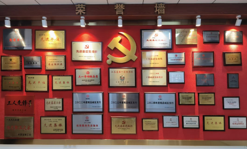 “江蘇省五一勞動獎狀”“年度精品城區(qū)支行”“五一巾幗標兵崗”……走進位于工商銀行南京新街口支行的榮譽室,各式獎牌掛滿了整整一面墻。