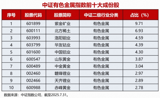 一般而言,能進(jìn)行份額拆分的基金通常都是過往業(yè)績表現(xiàn)較好的基金。正是優(yōu)秀的歷史業(yè)績壘高了基金凈值,為份額拆分提供了良好基礎(chǔ)。自2024年“9?24”行情啟動以來,有色龍頭ETF(159876)跟蹤的標(biāo)的指數(shù)——中證有色金屬指數(shù)表現(xiàn)明顯超越大盤。據(jù)滬深證券交易所數(shù)據(jù)統(tǒng)計(jì),2024.9.23至2025.7.31期間,中證有色金屬指數(shù)累計(jì)漲幅達(dá)33.47%,高于上證指數(shù)、滬深300指數(shù)同期29.99%、26.86%的漲幅表現(xiàn)(具體見下圖)。