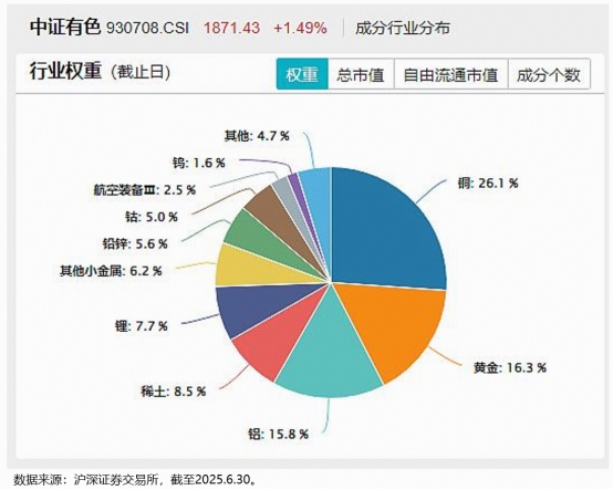 按照申萬三級行業(yè)口徑,截至今年6月末,中證有色金屬指數(shù)成份股中銅、黃金、鋁、稀土、鋰行業(yè)權(quán)重占比分別為26.1%、16.3%、15.8%、8.5%、7.7%,相對于投資單一金屬行業(yè),能夠起到分散風(fēng)險(xiǎn)的作用,適合作為投資組合的一部分進(jìn)行配置(具體見下圖)。