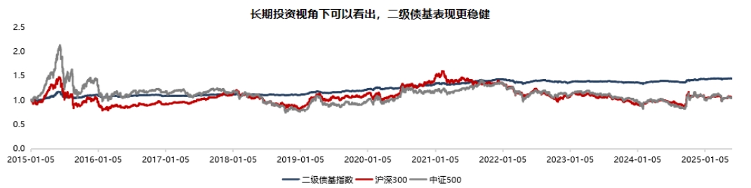 作為唯一一類既能投資債券市場,又能投資股票二級市場的債券型基金,二級債基通過將不低于80%的資產投資于債券市場,獲取穩定的票息收益,同時利用不超過20%的資產靈活參與股票市場,捕捉上漲機會。這種“穩中求進”的策略,使得二級債基在長期投資中表現出色。以混合債券型二級基金指數為例,近五年其年化收益率為3.3%,遠超滬深300(-0.14%)和中證500(0.99%)等主流寬基指數;同時,最大回撤為-6.93%,遠低于滬深300(-45.60%)和中證500(-41.81%),充分展示了二級債基在不同市場環境下的適應能力和獲取長期收益的潛力。(數據來源:Wind,截至2025.05.31)