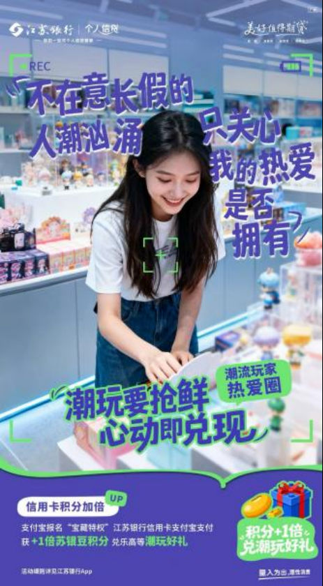 圍繞民眾節日期間旅行、親子、潮玩、家居等多元消費需求,江蘇銀行推出“玩轉小長假”系列主題活動,涵蓋信用卡支付隨機減、寶藏特權雙倍積分、消費貸福利限時加碼、“撒歡計劃”旅行基金抽獎等多重權益。