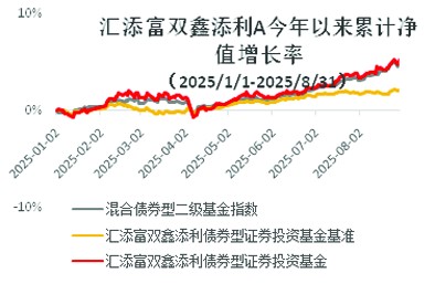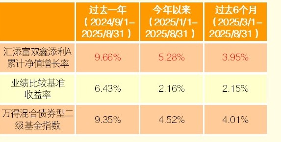 匯添富雙鑫添利由匯添富年年豐定期開放轉型而來,屬于穩健型二級債基(股票倉位0-20%,港股占權益倉位比例不超過50%),主要投資于債券類固收品種,同時在控制風險的前提下精選滬港深三地優秀個股。今年以來基金業績亮眼,累計回報5.28%,超越同期業績比較基準(2.16%)和萬得混合二級債基指數收益(4.78%)(截至2025年8月31日)。