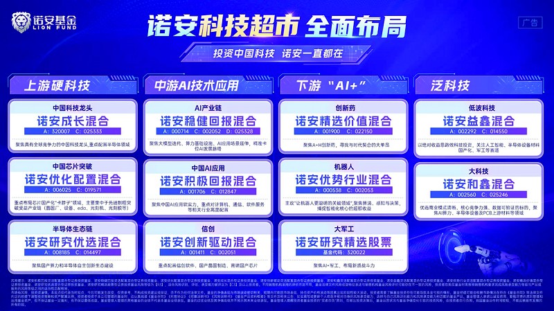 諾安基金科技組依托對(duì)科技產(chǎn)業(yè)的前瞻洞察,打造了層次豐富的“科技超市”,產(chǎn)品以主動(dòng)權(quán)益為主,進(jìn)行全方位布局,包括:上游“硬科技”的中國科技龍頭、中國芯片突破、半導(dǎo)體生態(tài)鏈;中游“AI技術(shù)應(yīng)用”的AI產(chǎn)業(yè)鏈、AI應(yīng)用、信創(chuàng);再到下游“AI+”的創(chuàng)新藥、機(jī)器人、大軍工等。目前已布局十一只產(chǎn)品,為投資者投資科技板塊提供“一站式投資選擇”。