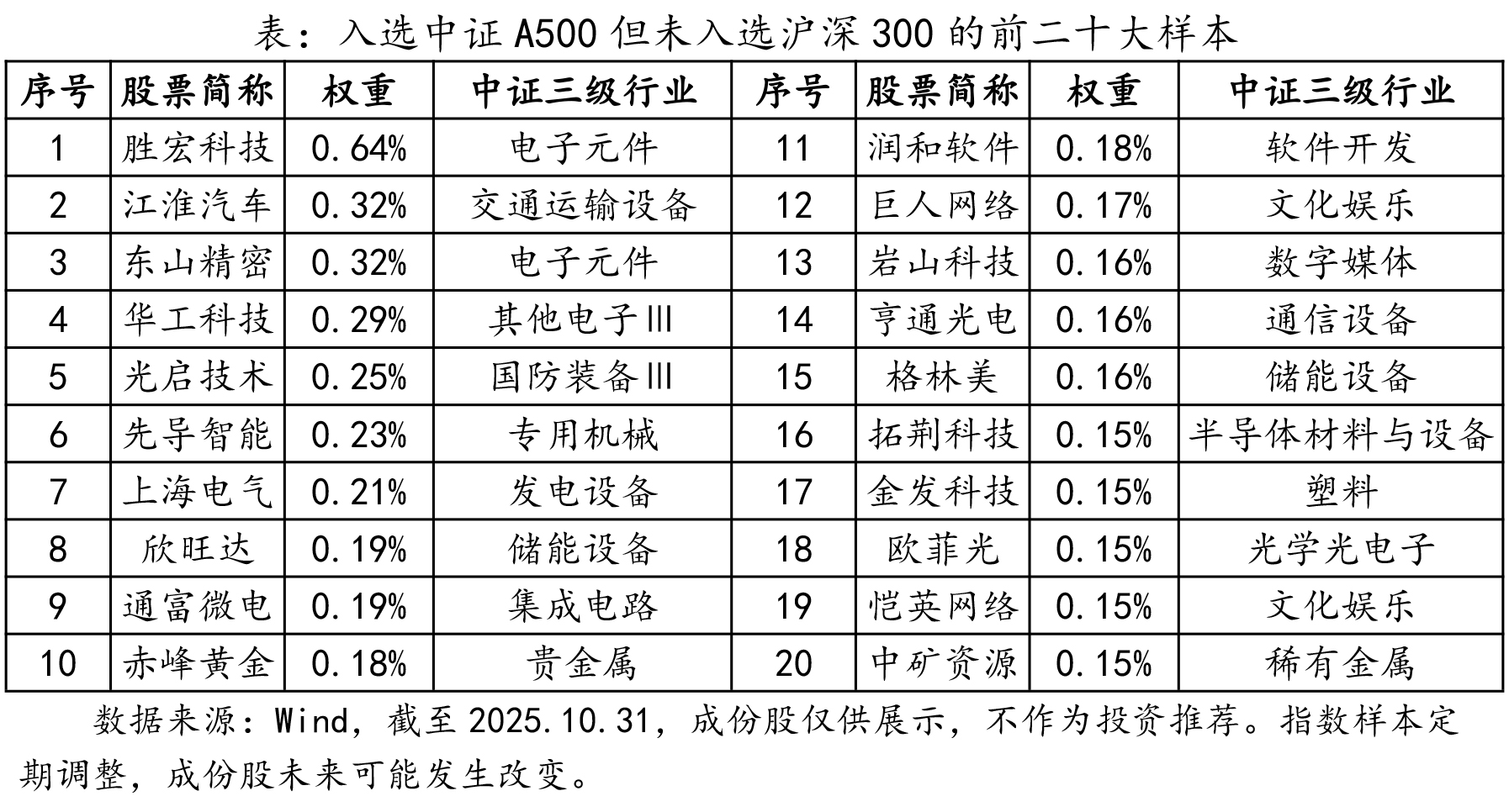 從最新一期樣本來看,中證A500與滬深300既有232只共有的成份股,也存在大量的不重合的股票。滬深300中有68只股票未被納入中證A500,主要為大市值金融股。而中證A500指數(shù)中有268只不在滬深300中,這些股票平均市值為361億元,廣泛分布于電子、基礎(chǔ)化工、電力設(shè)備與新能源、國防軍工和醫(yī)藥等眾多細分領(lǐng)域。