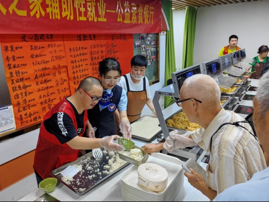 每天中午11點開始,南京市鼓樓區中央門街道新模范馬路9號的社區食堂都格外熱鬧,這里飯菜飄香,人流不斷,不少老人甚至每天專門坐公交車來“打卡”。吸引老人們的不光是可口實惠的飯菜,更是餐廳里來自建行南京分行的志愿者與一群大齡心智障礙者給予的溫情陪伴。三年多的時間里,這家由建行南京分行支持建立的“公益素食餐廳”不僅累計為社區高齡老人、殘疾人等18萬人次提供公益午餐,更成為探索“大齡心智障礙”青年走出家門、融入社會的實驗田。