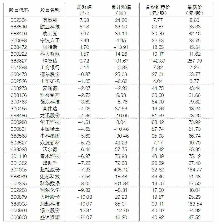 大眾30指數成份股中,本周漲幅前五位的分別是英威騰、航亞科技、凌云光、寧波方正、阿特斯,漲幅分別為7.58%、5.18%、3.97%、3.49%和1.70%;跌幅榜上,盛達資源、錫業股份、瀾起科技、大葉股份等跌幅居前。