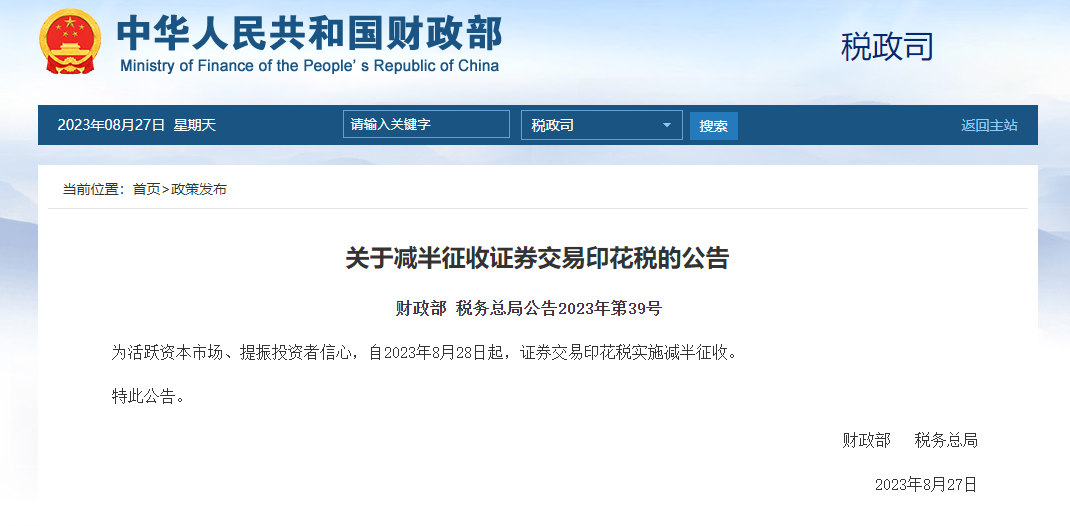 8月27日,財政部、稅務總局公告,為活躍資本市場、提振投資者信心,自2023年8月28日起,證券交易印花稅實施減半征收。
