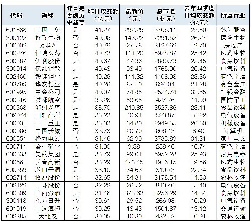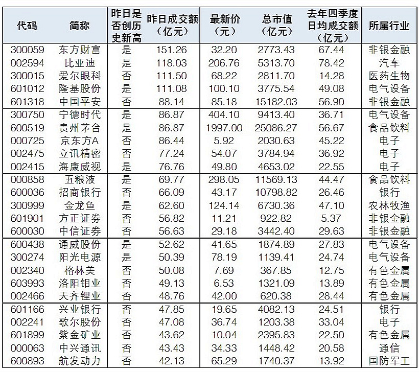 A股昨日迎來“開門紅”,兩市成交額突破一萬億元。根據(jù)Wind數(shù)據(jù)統(tǒng)計,昨日50股成交金額超30億元,其中東方財富、比亞迪、愛爾眼科、隆基股份成交金額超百億元。