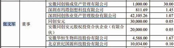 雅創電子董事會由7名董事組成,其中公司董事張文軍為股東同創錦榮、同創安元、同創新興委派,他本身為一個“投資多面手”,在多家公司有兼職信息。雅創電子招股書披露,張文軍投資的企業有七家,其中包括安徽同創錦成資產管理有限公司、深圳市瑪塔創想科技有限公司、深圳同創偉業資產管理股份有限公司、同創安元、安徽同創安元股權投資合伙企業(有限合伙)、安徽華恒生物科技股份有限公司、北京世紀國源科技股份有限公司等(見圖三),他在這7家公司的持股比例從0.10%到30%不等。