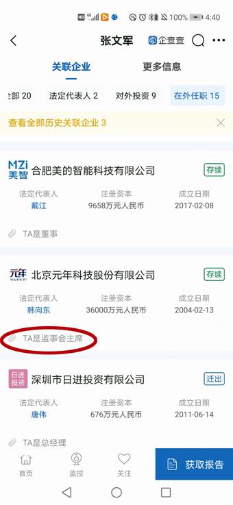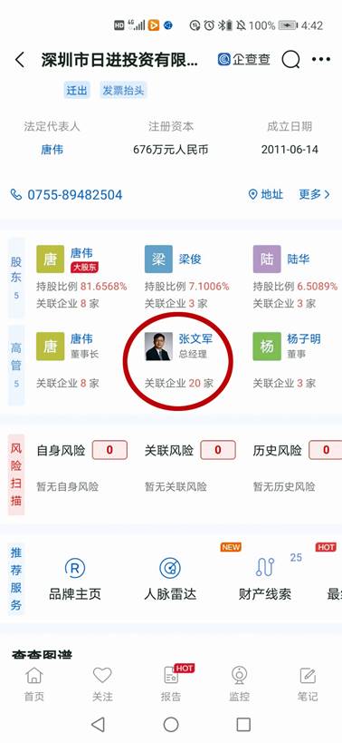 然而企查查顯示,除了上述公司,張文軍還在北京元年科技股份有限公司擔任監事會主席(見圖五),并且通過股權鏈在該公司享有0.03%的股份權益。而他在深圳市日進投資有限公司擔任總經理職務(見圖六)。 對這兩家企業,招股書中對雅創電子的關聯方中卻沒有任何披露。