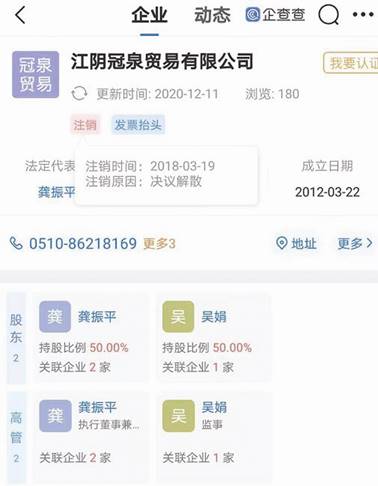 招股書顯示,趙建明曾實際持有江陰冠泉貿易有限公司(以下簡稱“冠泉貿易”)100%股權(見圖一)。不過,企查查顯示,冠泉貿易成立于2012年3月22日,注銷于2018年3月19日,股東為龔振平、吳娟,分別持股50%,而且存續期間沒有出現過股東變更登記(見圖二、圖三)。