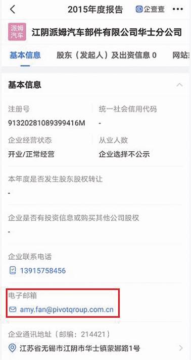 更吊詭的是,派姆汽車向當地市監機構提交的2015-2016年年度報告中,披露的電子郵箱均為*****@pam-auto.com(此郵箱名稱用*代替)。而派姆汽車華士分公司2015年度報告中,使用的則是amy.fan@pivotqroup.com.cn(見圖五)。