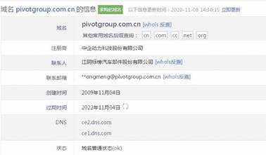 根據標榜股份招股書,公司公開郵箱為public@pivotgroup.com.cn,官網為http://www.pivotautomotive.com(見圖六)。通過技術手段查詢顯示,標榜股份使用的郵箱@pivotgroup.com.cn,系通過注冊商中企動力注冊,創建時間為2009年11月4日(見圖七)。